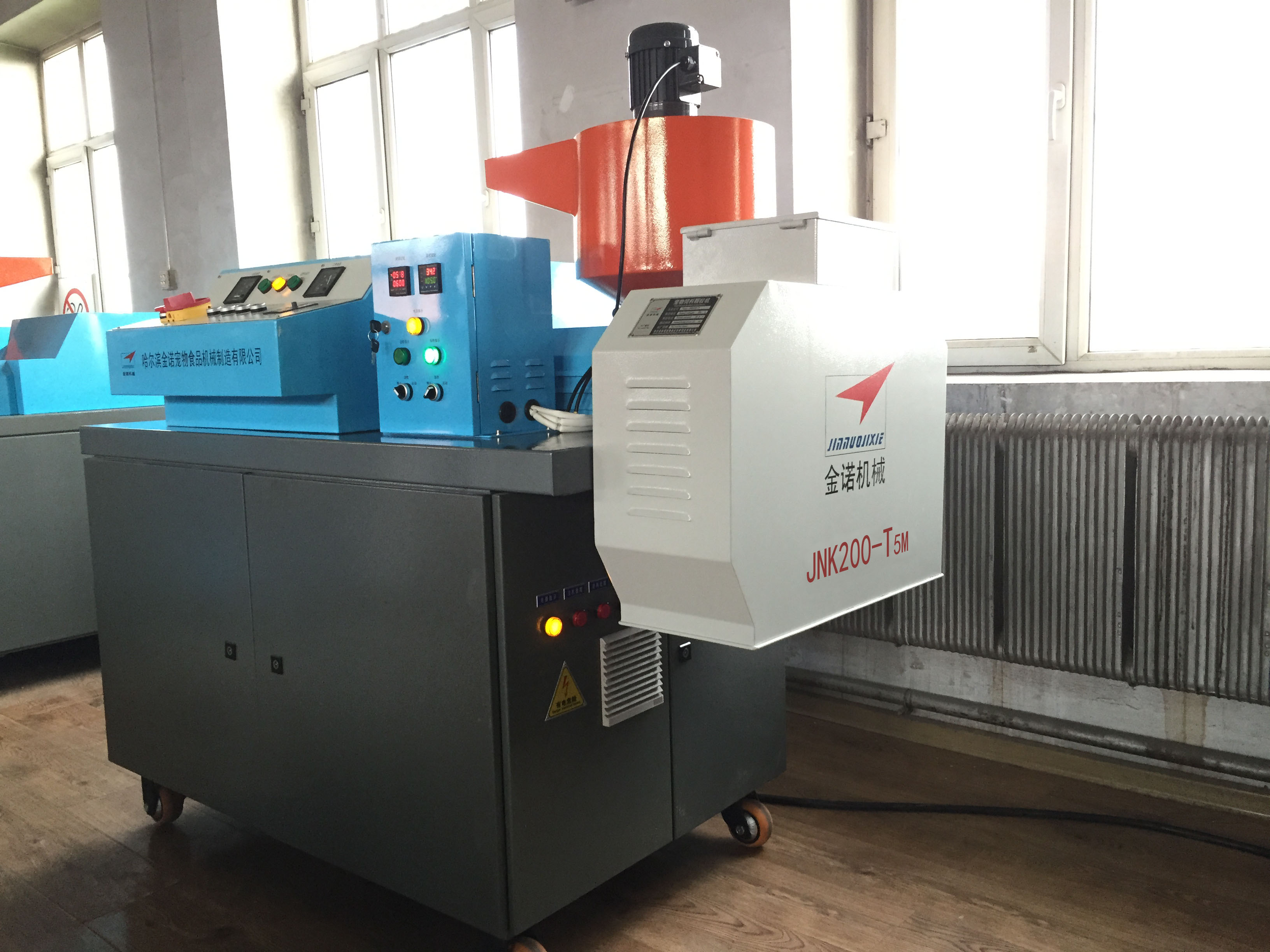 狗糧加工設(shè)備JNK200-T5M:1。JNK200-T5M型狗糧加工設(shè)備安裝方便、出廠已經(jīng)試機(jī),狗糧機(jī)切刀采用直角切刀技術(shù),調(diào)試簡(jiǎn)單;2。狗糧設(shè)備的主軸和切刀小軸均可隨時(shí)注入耐高溫潤滑脂,延長(zhǎng)狗糧機(jī)的軸承使用壽命;3。JNK200-T5M狗糧設(shè)備每小時(shí)生產(chǎn)狗糧顆粒200公斤。